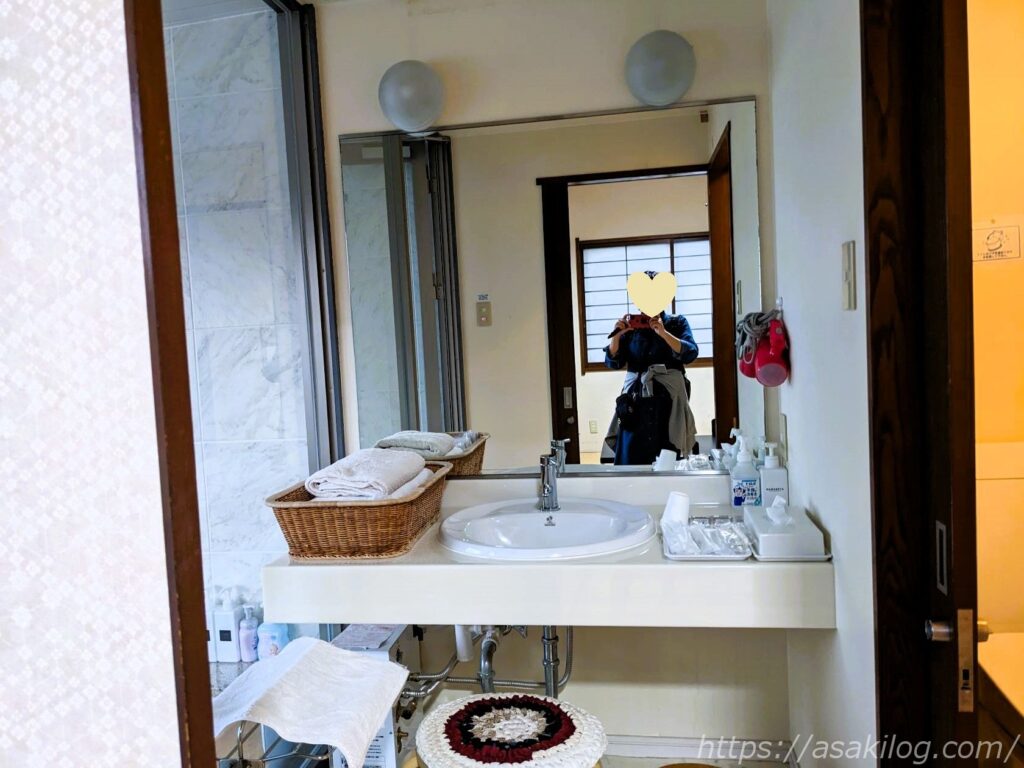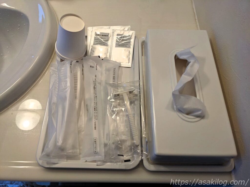 アメニティは洗面台にまとめて置いてあります。無印良品の化粧水・乳液があり嬉しかった!
