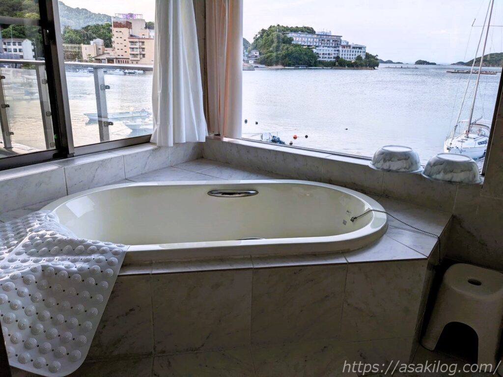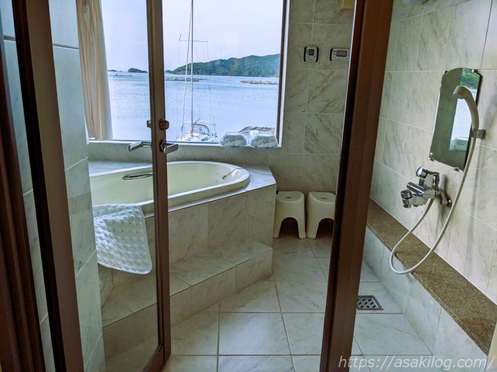 また右側の展望風呂はガラス張りなので、ここからも海を眺めることができますよ。