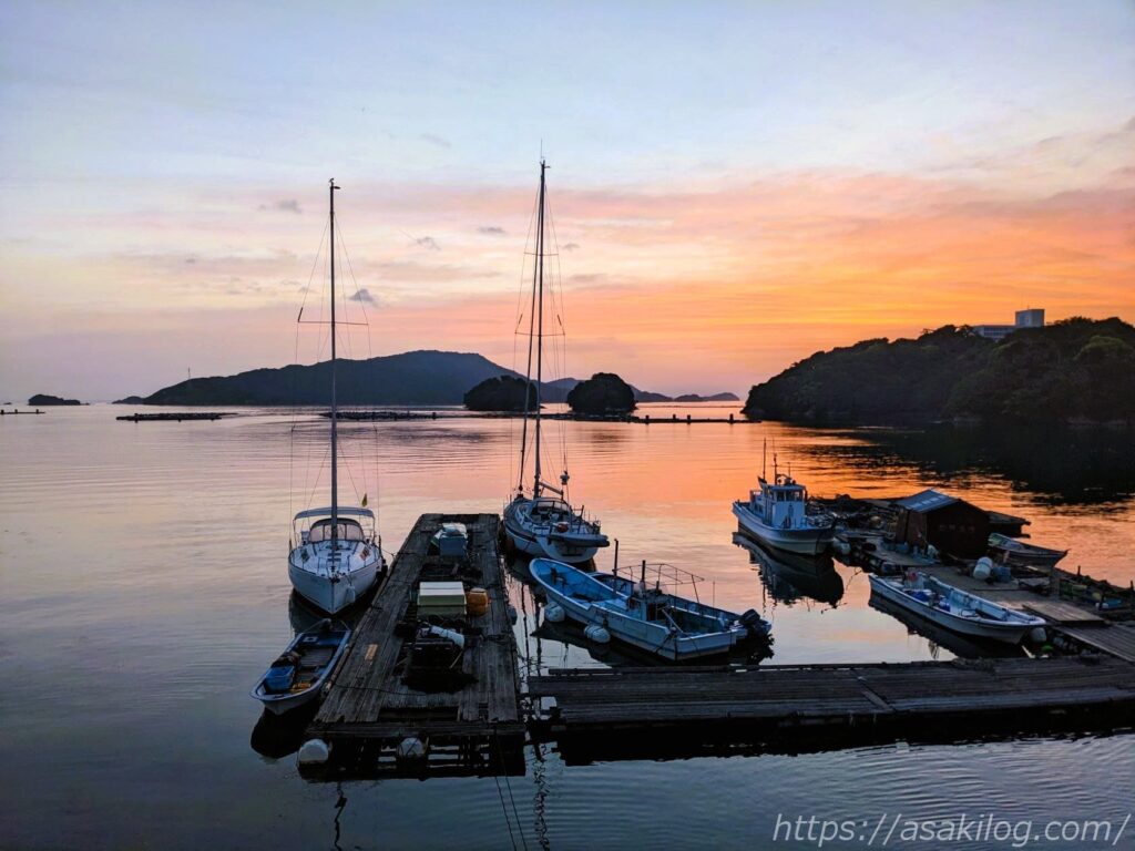 オレンジ色に染まる海がとっても綺麗な美景。また目の前のボートには釣りに行く人たちが乗り込んでいます。ゆったりのんびりと贅沢な時間を過ごせました。