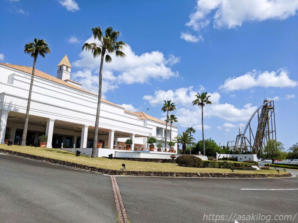 今回は滞在予定の「ホテル志摩スペイン村」の駐車場を利用しました。ホテルのリゾート風の素敵な外見と、すぐそこにパルケエスパーニャのアトラクション「ピレネー」が見えて、テンションが上がる!