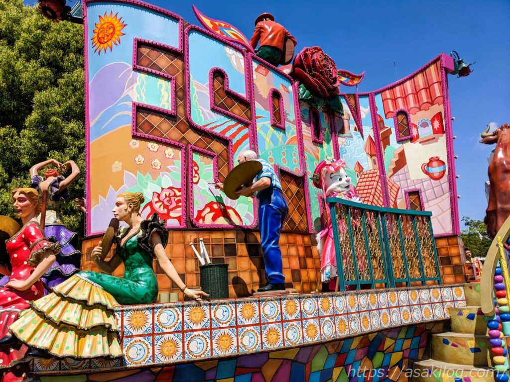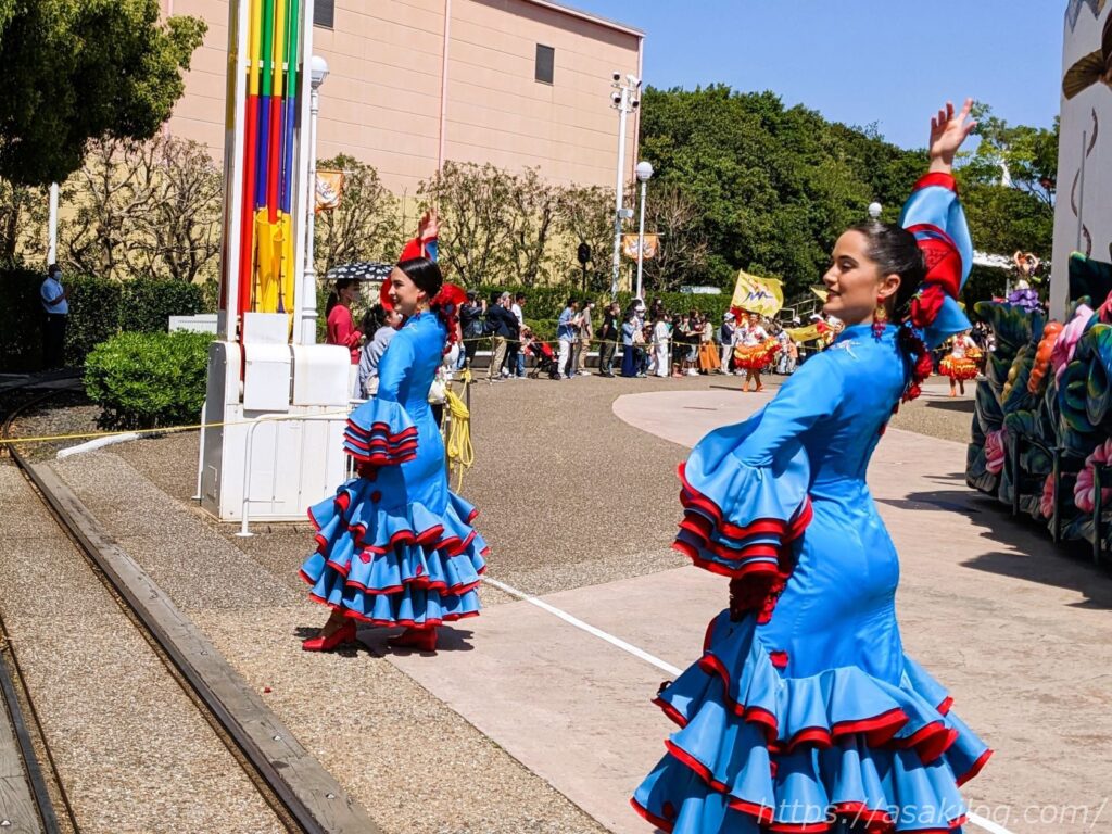 「エスパーニャカーニバル アデランテ」は、パルケエスパーニャのパレードルートで行われる昼のパレードで、上演時間は約25分ほどです。