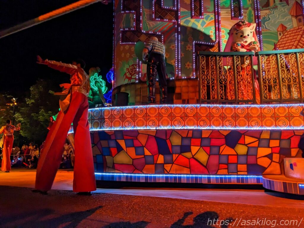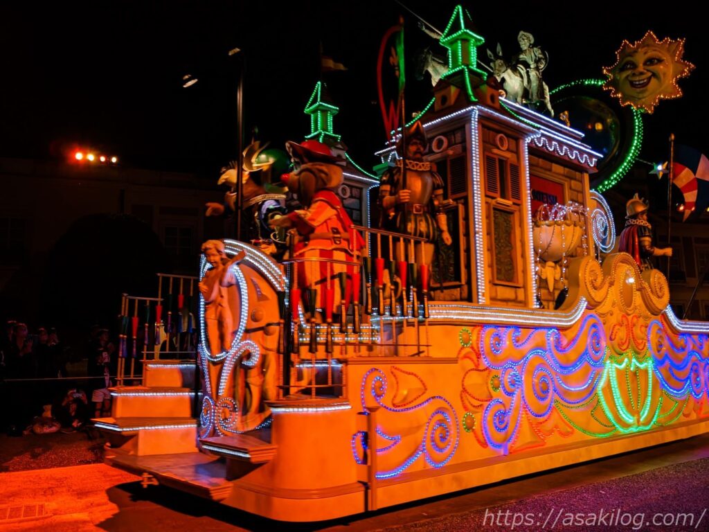 昼のパレードで一度見たはずのフロートも、夜のパレードではまた違った雰囲気で楽しめました(左の写真がちょっと怖い)。
