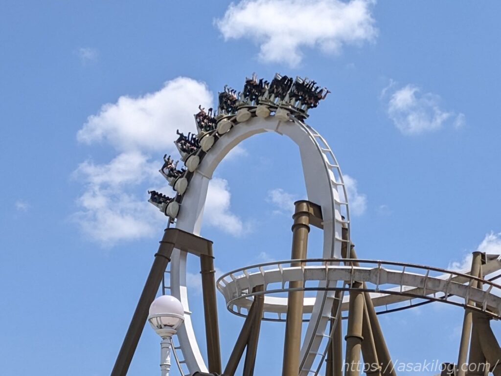 夫君の感想は「コースター最前列で宙ぶらりん・高速疾走しながら大回転・首から肩へ強烈な重力で、これはやばかった!」とのことでした。