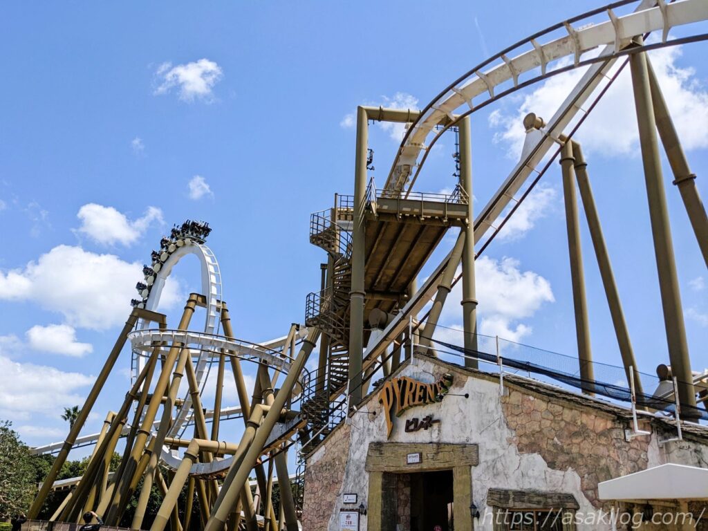 フィエスタ広場入口のすぐ目の前にあった「ピレネー」は吊り下げ式のジェットコースター。スペインとフランスの国境を走るピレネー山脈をモチーフにしたインバーテッドコースターで、全長1,234m、最高時速100km、猛スピードで急旋回・急降下するスリル満点の絶叫マシンです。