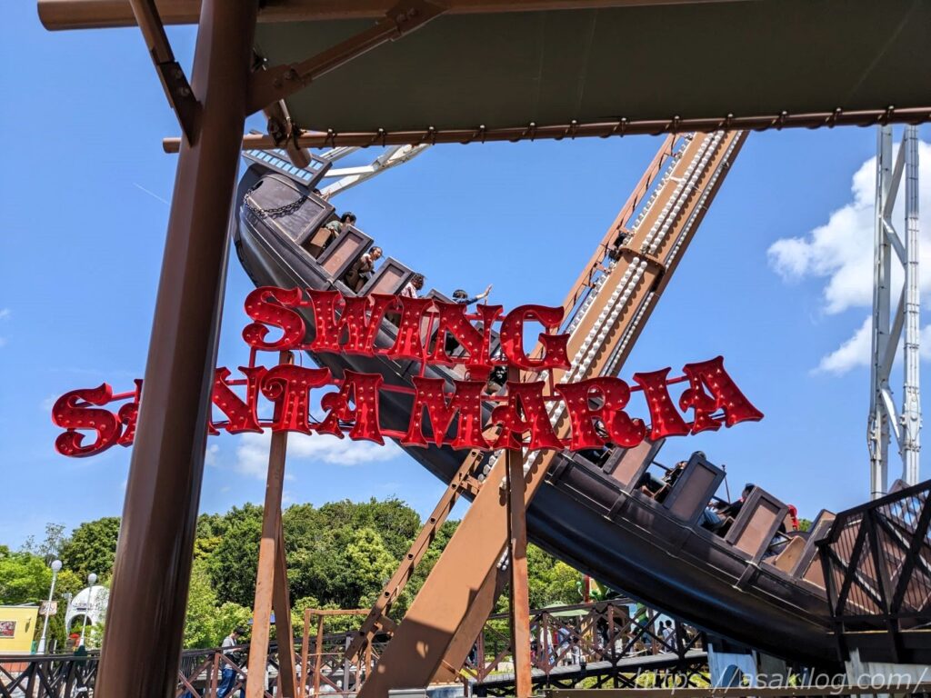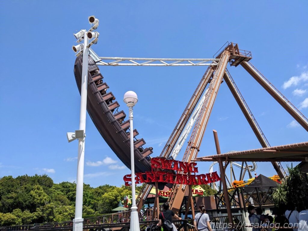 「スウィングサンタマリア」は、ダイナミックなスウィングを体感できる!いわゆるバイキング。大航海時代、コロンブスを乗せて大海原を航海したサンタマリア号をモチーフにしたアトラクションです。