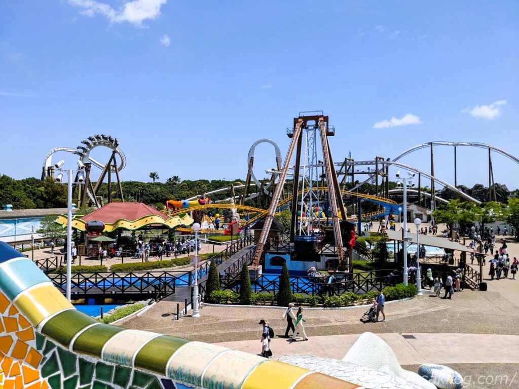 グエル広場の上から、フィエスタ広場のアトラクション全容を眺めることもできます。