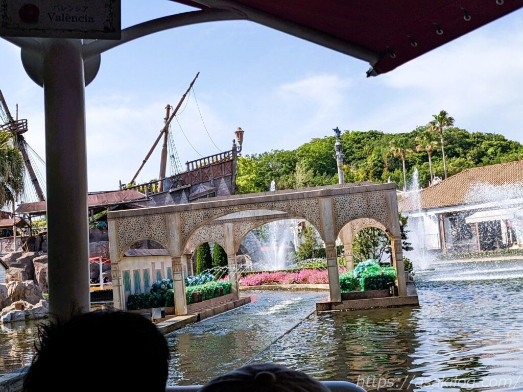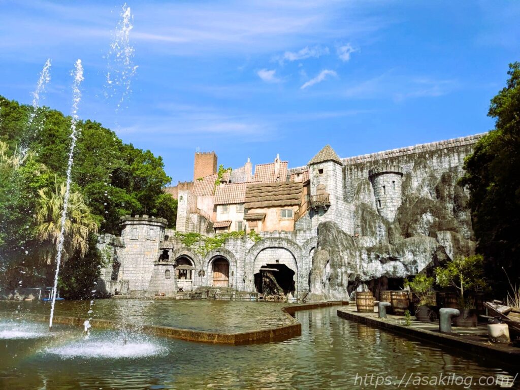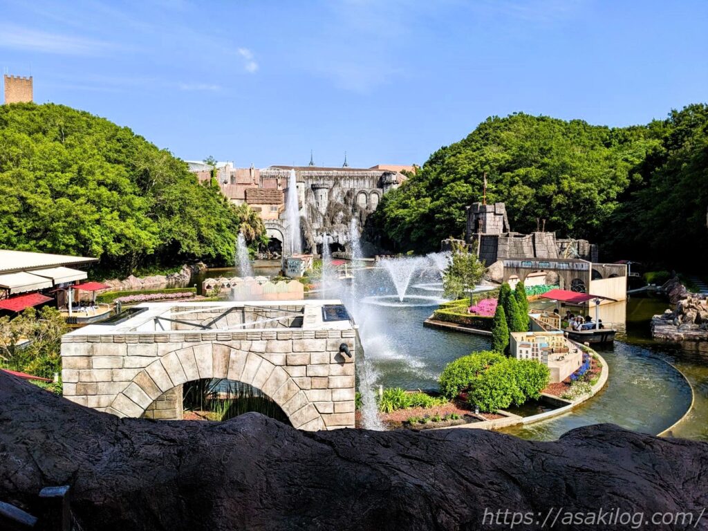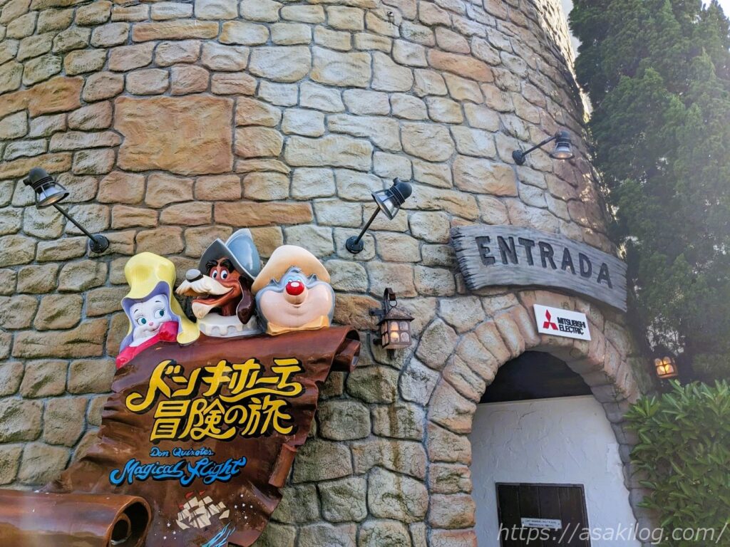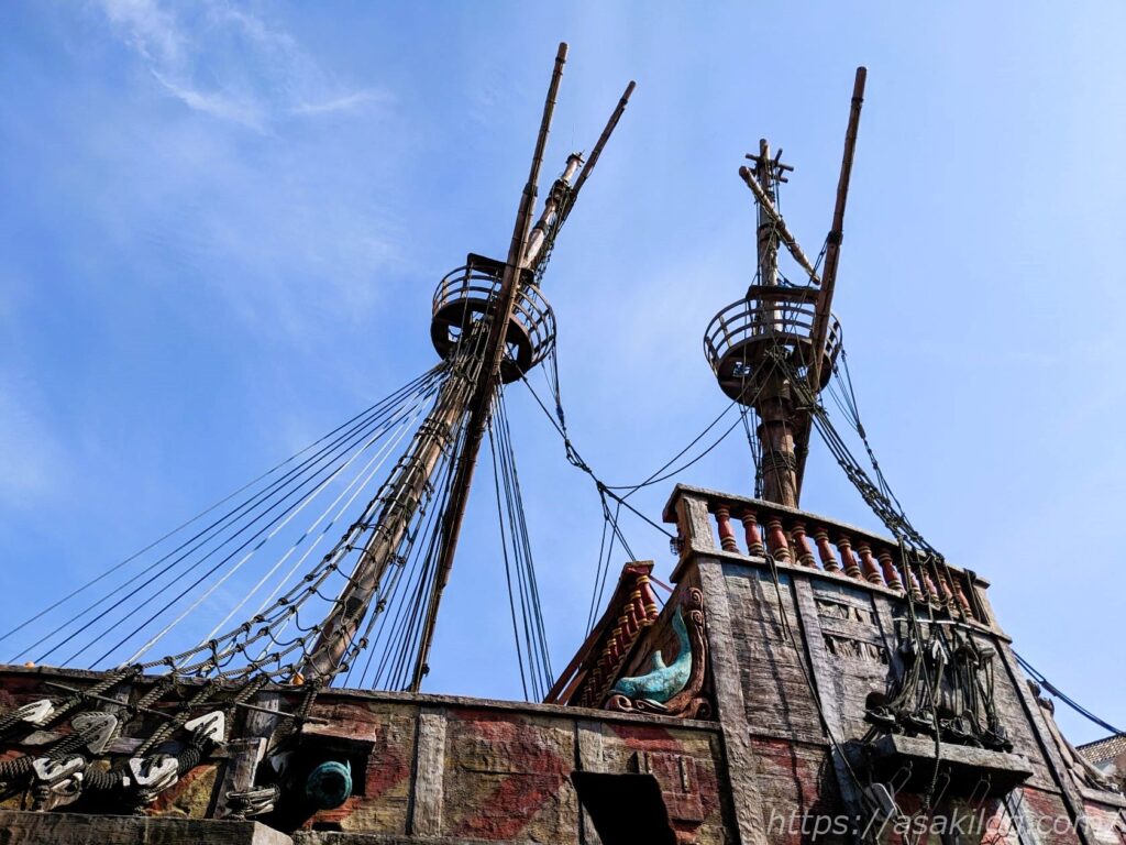 左の写真は「ガリオン船 アルナ号」そばの通りから撮影、右の写真は後述の「ドンキホーテ冒険の旅」の列に並びながら撮影しました(手前はチャプチャプラグーン)。絵になる写真がたくさん撮れて満足。