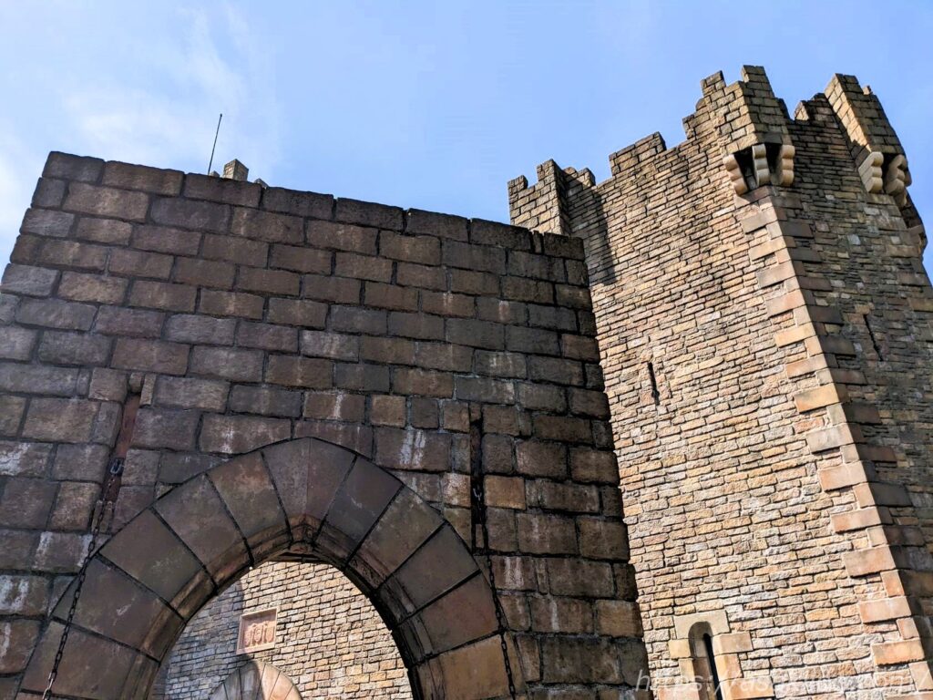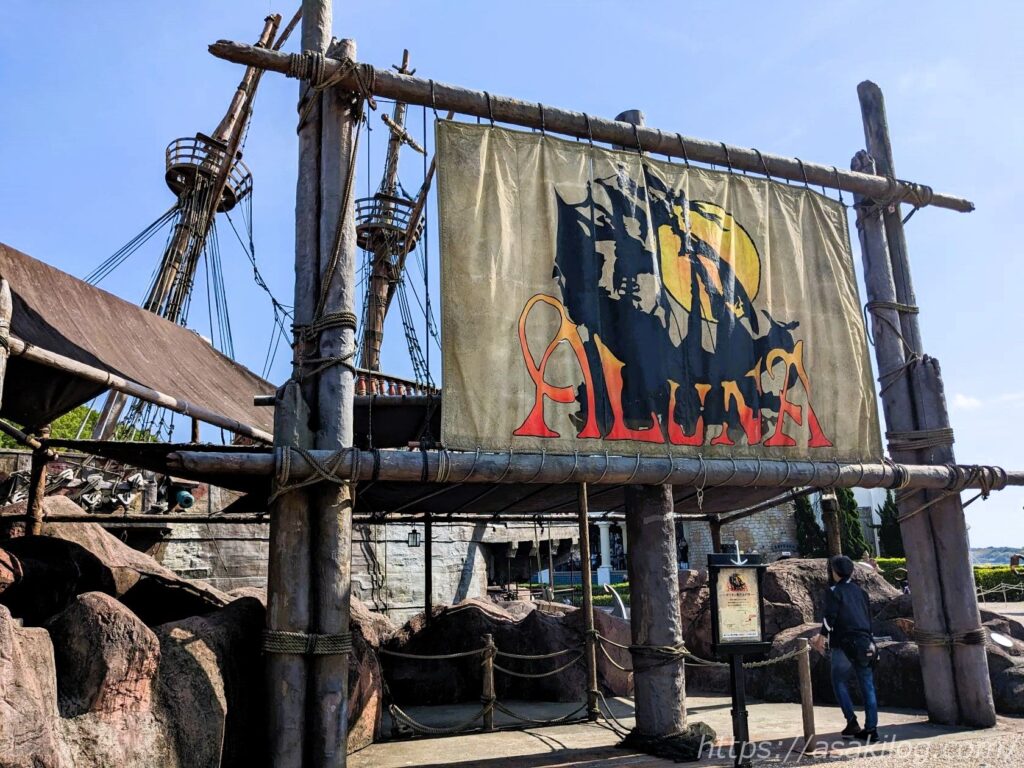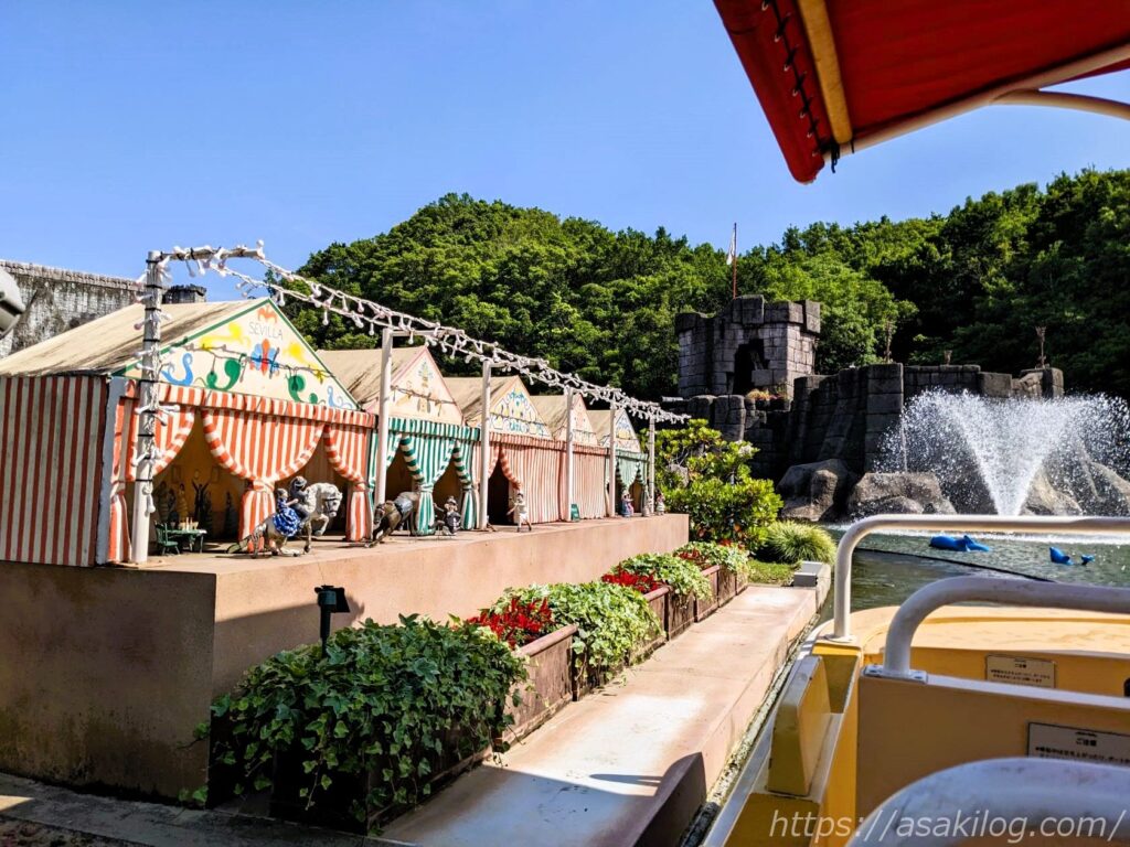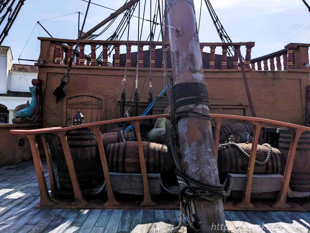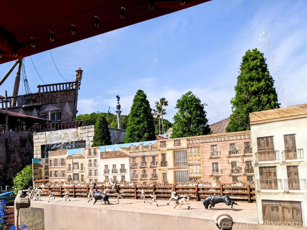 左の写真は「ガリオン船 アルナ号」そばの通りから撮影、右の写真は後述の「ドンキホーテ冒険の旅」の列に並びながら撮影しました(手前はチャプチャプラグーン)。絵になる写真がたくさん撮れて満足。