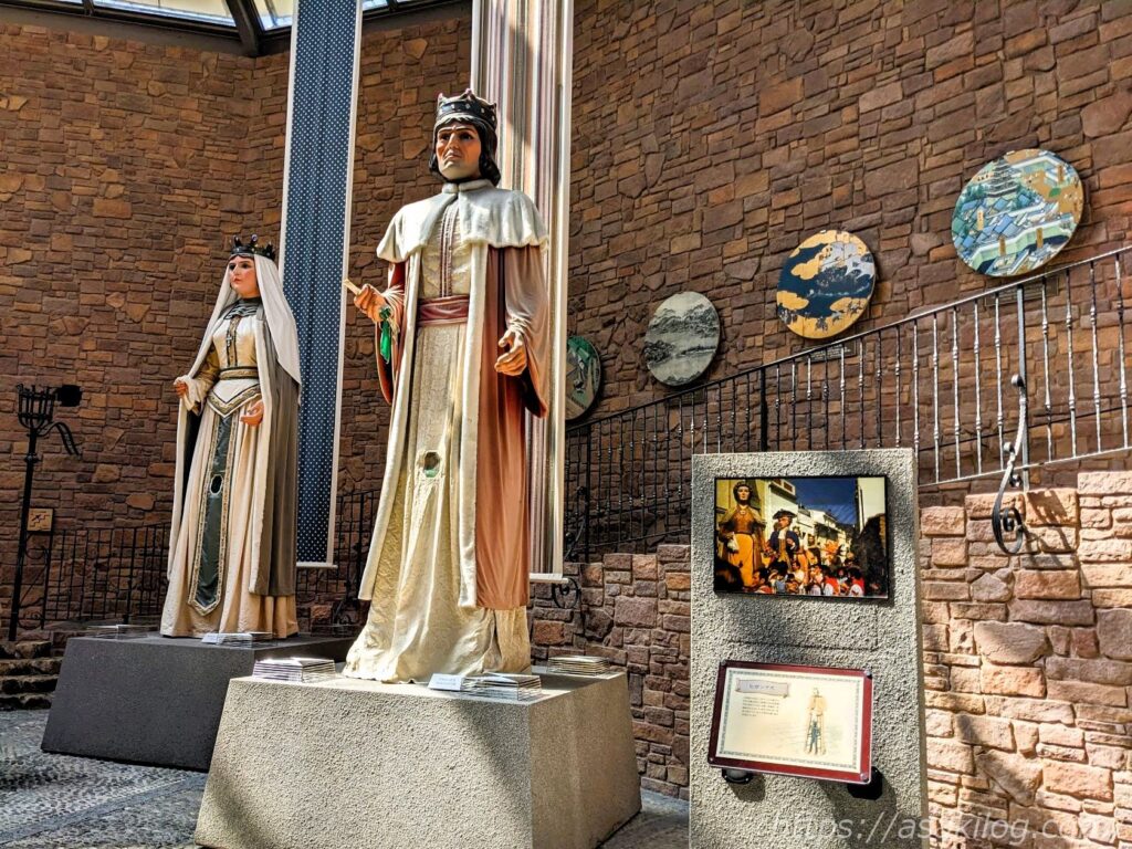 最初のヒガンデス(巨大人形)とは別のものもありました。娘が並ぶとその大きさがよくわかりますね! こちらの2つのモデルは、カタルーニャの女性・カタルーニャの男性です。
