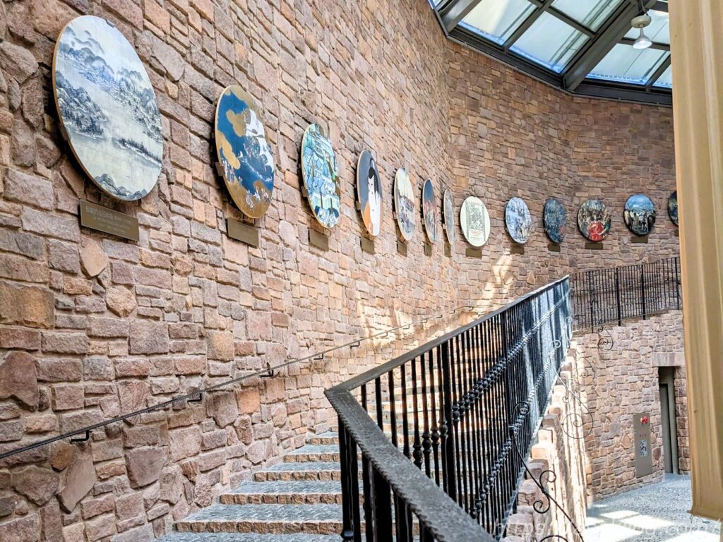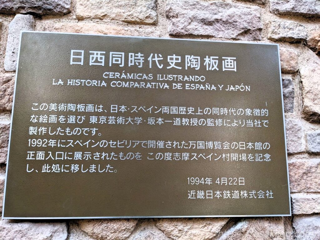 階段に展示してある美術陶板画は、日本・スペイン両国歴史上の同時代の象徴的な絵画を選んで製作したもので、1992年にスペイン・セビリアで開催の万国博覧会の日本の正面入り口に展示されたものを、志摩スペイン村の開場を記念しここで展示しています。