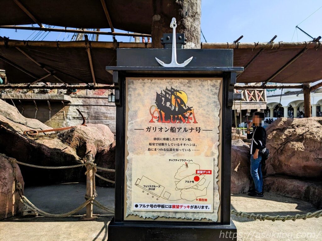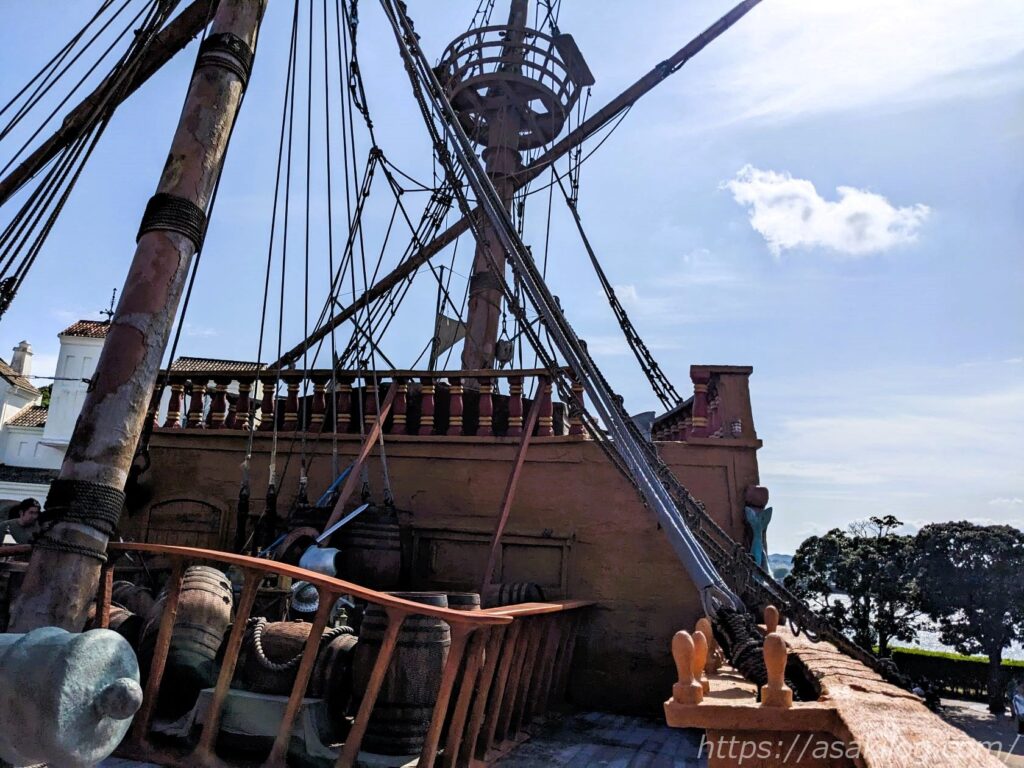 こちらの砂浜に座礁した「ガリオン船 アルナ号」は、冒険心くすぐられるフォトスポットです(アトラクションではありません)。