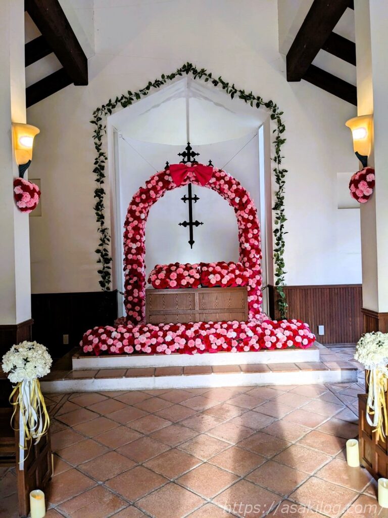 素敵な教会には赤・白・ピンクのお花、リヤカーのような台車にもお花がたくさん。