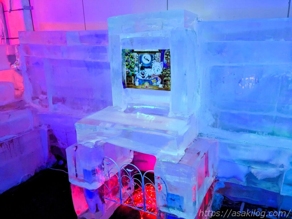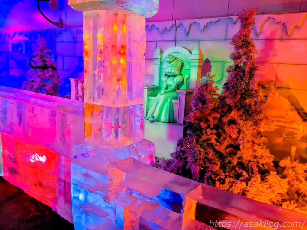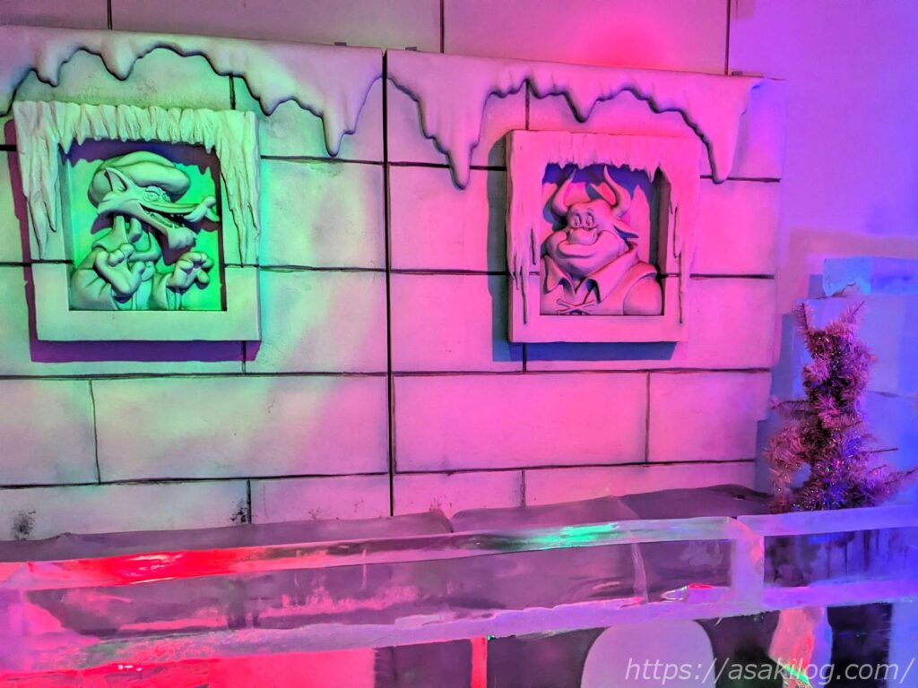 中へ入るとヒンヤリした冷気が身体を包み、氷点下の世界を楽しめます。美しく凍ってしまったキャラクターたちのオブジェもありました。