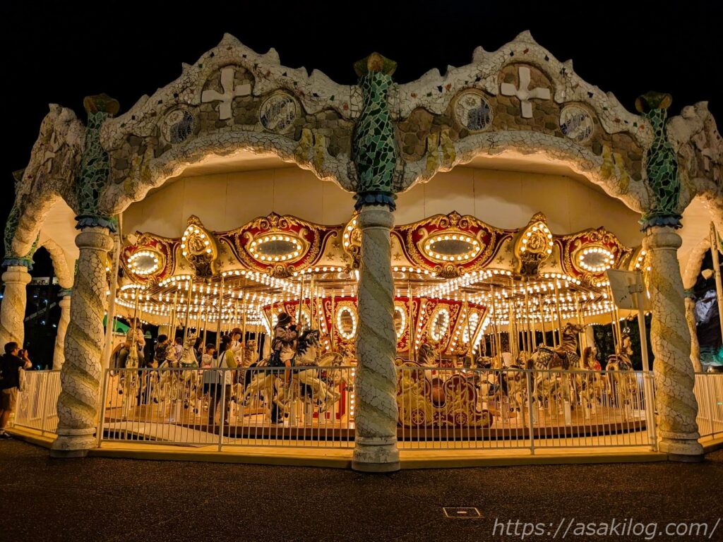 ガウディカルーセルは、光とともに浮かびあがる夜のほうが、より幻想的な雰囲気で素敵でした。