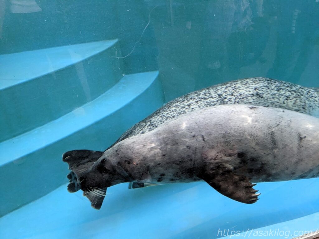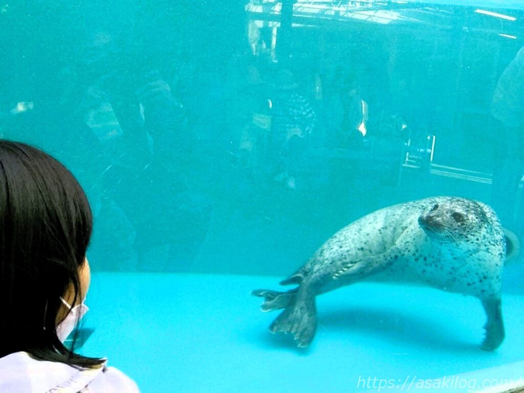 ずーっと泳ぎ続けるゴマフアザラシ。夫君が「娘と見つめ合ってる写真」を撮影していました、ナイスショット! それにしてもアザラシって「海の犬」と呼ばれているだけあって、顔が犬っぽいなぁとじーっと眺めてしまいました。