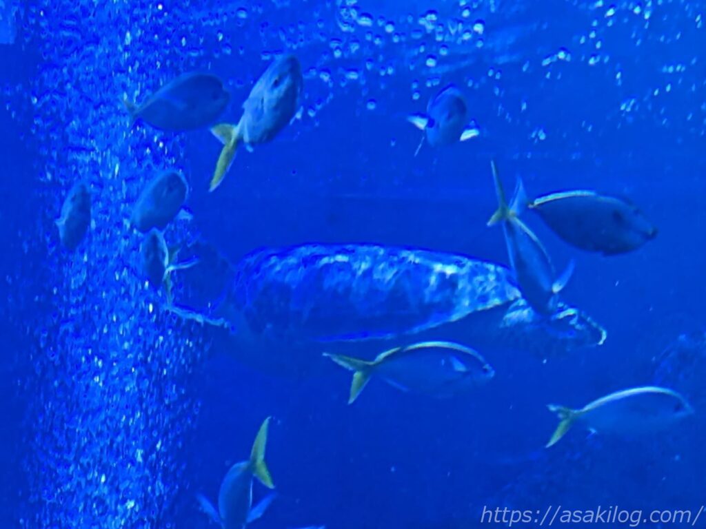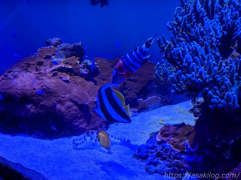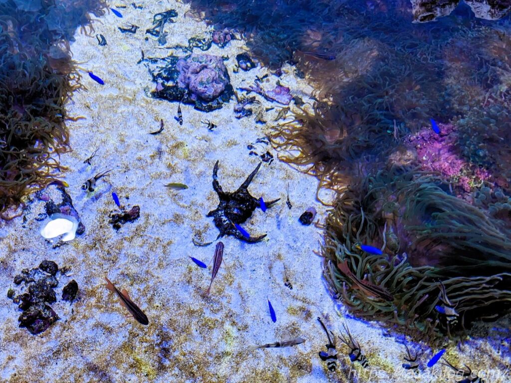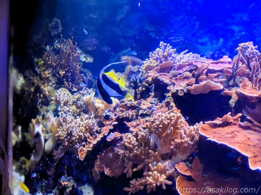 ツノダシ、ハタタテダイ、フエヤッコダイ、ゴシキエビ、アオウミガメなど、サンゴ礁に住む生き物がたくさん。カラフルな熱帯魚が泳ぐ色鮮やかなサンゴ礁の海が再現されていました。