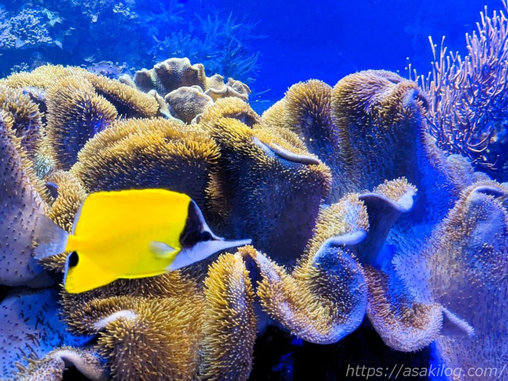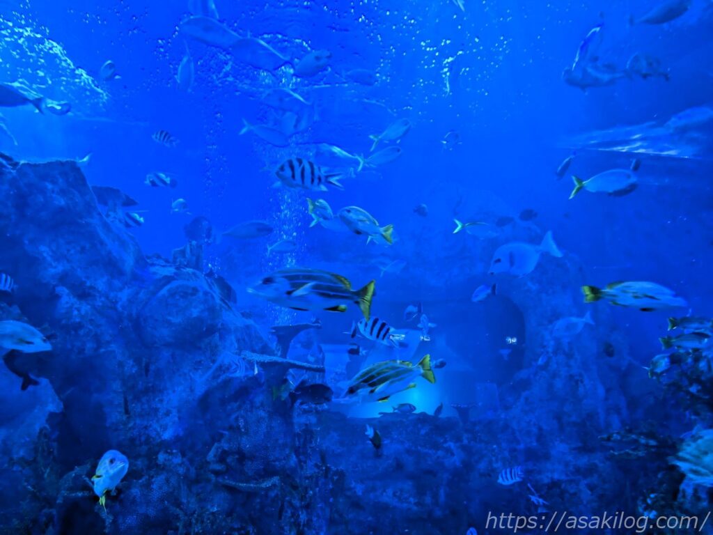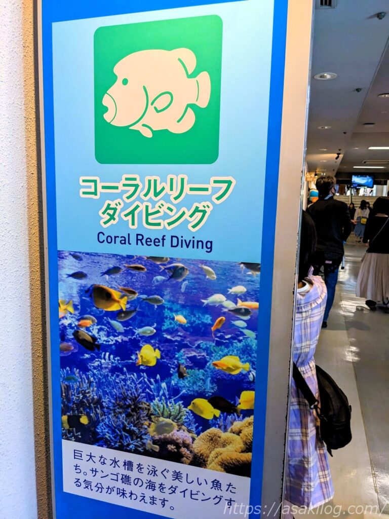 ここは水族館出入り口に繋がっていて「コーラルリーフダイビング」の水槽も眺められる場所。私が入場した際はじっくり見れなかった(多分通らなかった?)ので、直営店メインショップでお土産を購入した後に立ち寄って、しばし休憩しました。