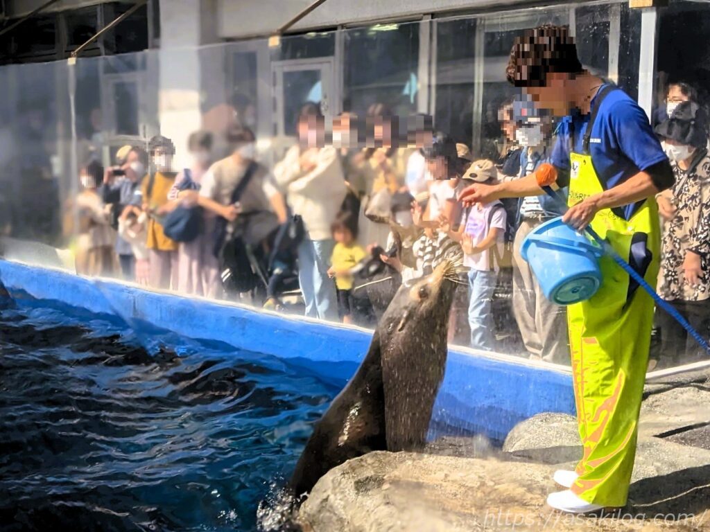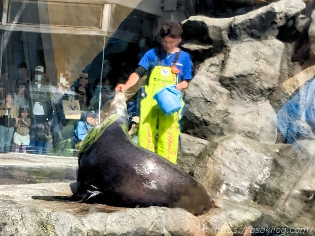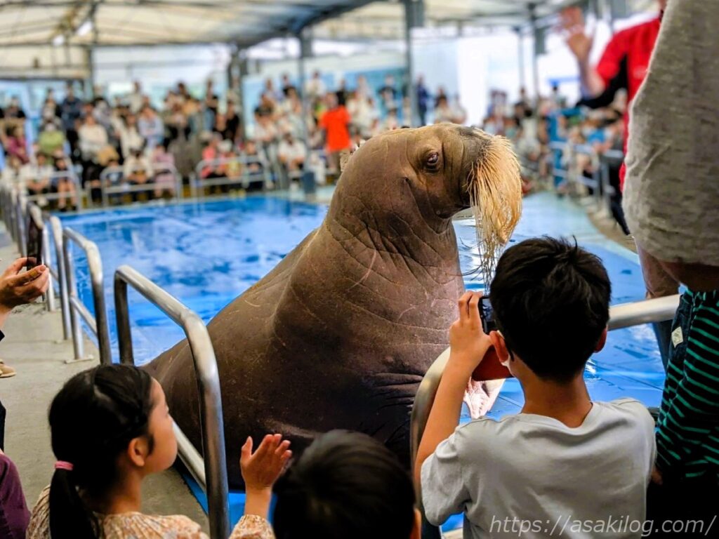 セイウチふれあいタイムは大賑わい。遠くから眺めても、セイウチの大きさは伝わりました。
