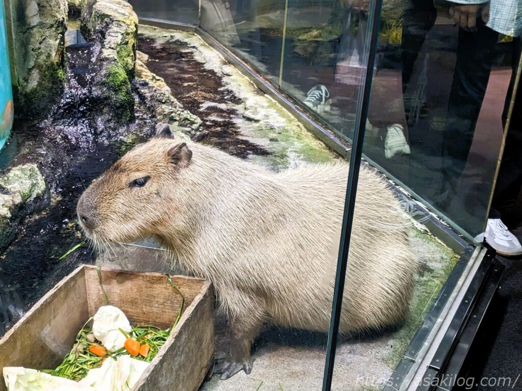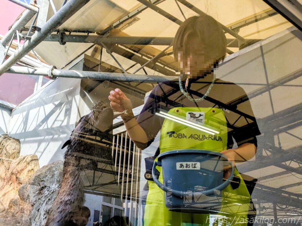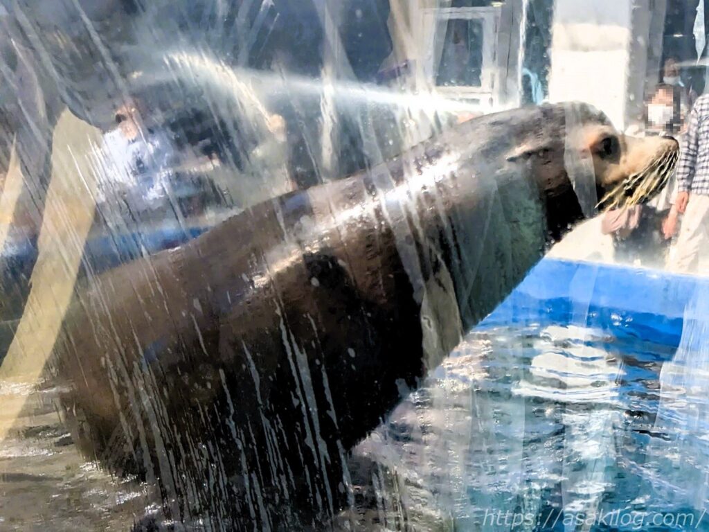 目の前でカリフォルニアアシカにエサをあげている様子を見ることができました。チューブの中から撮影したため、画質はいまいちです。