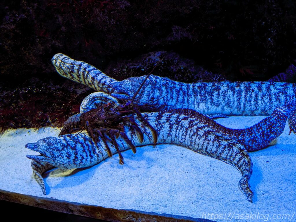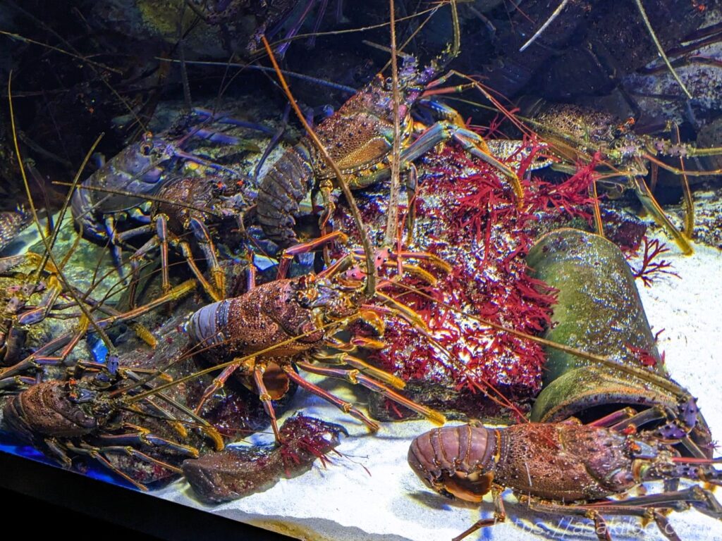 クエ、アカハタ(多分)、タカアシガニ、ウツボと伊勢エビ、最後の写真は伊勢エビがいっぱーい!