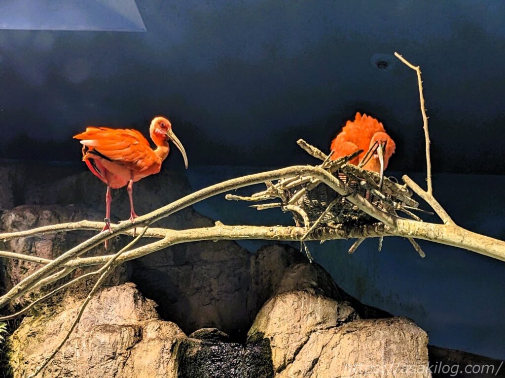 まずは人気のカピバラ、いつ見ても可愛いですね。同じエリアの頭上には、鮮やかなオレンジ色のショウジョウトキがいました。