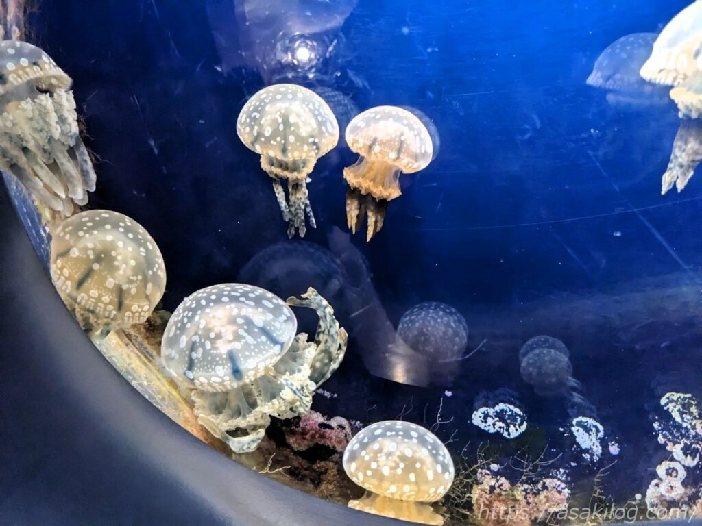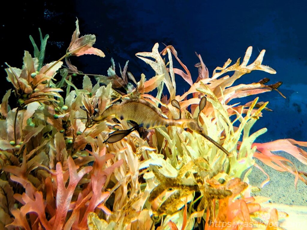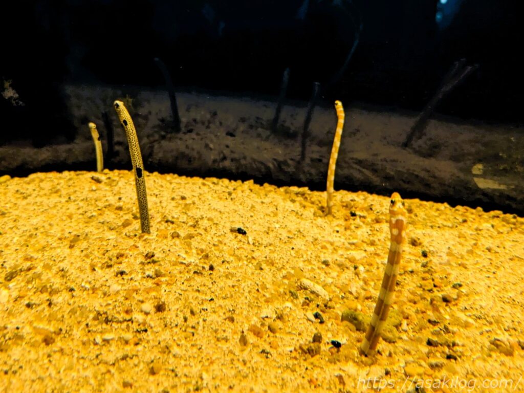 「特別展示室」のコーナーでは、水中をふわふわと漂い癒されるクラゲと、葉っぱにそっくりのウィーディ・シードラゴン、そしてにょろにょろのチンアナゴとニシキアナゴもいました。
