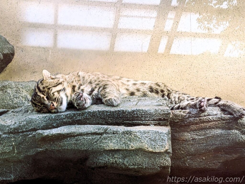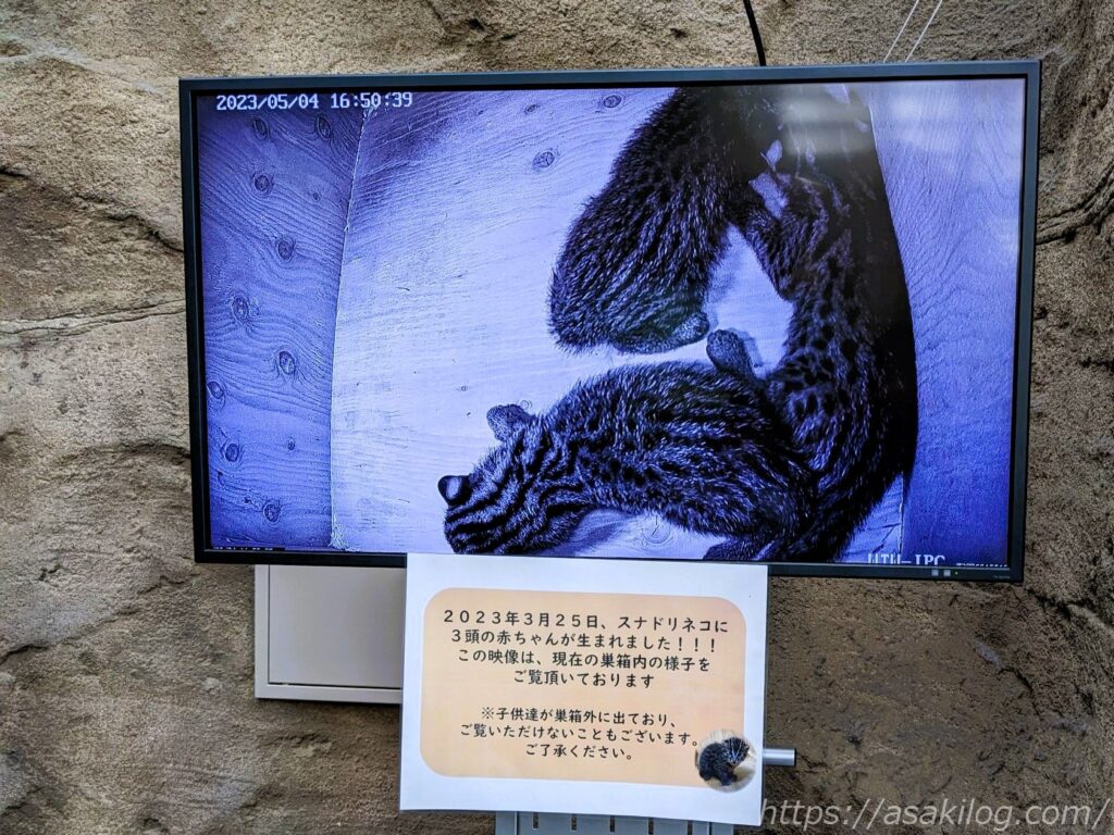 スナドリネコは、すやすやお昼寝中。2023年3月25日に生まれたばかりの赤ちゃんは、映像で展示しています。