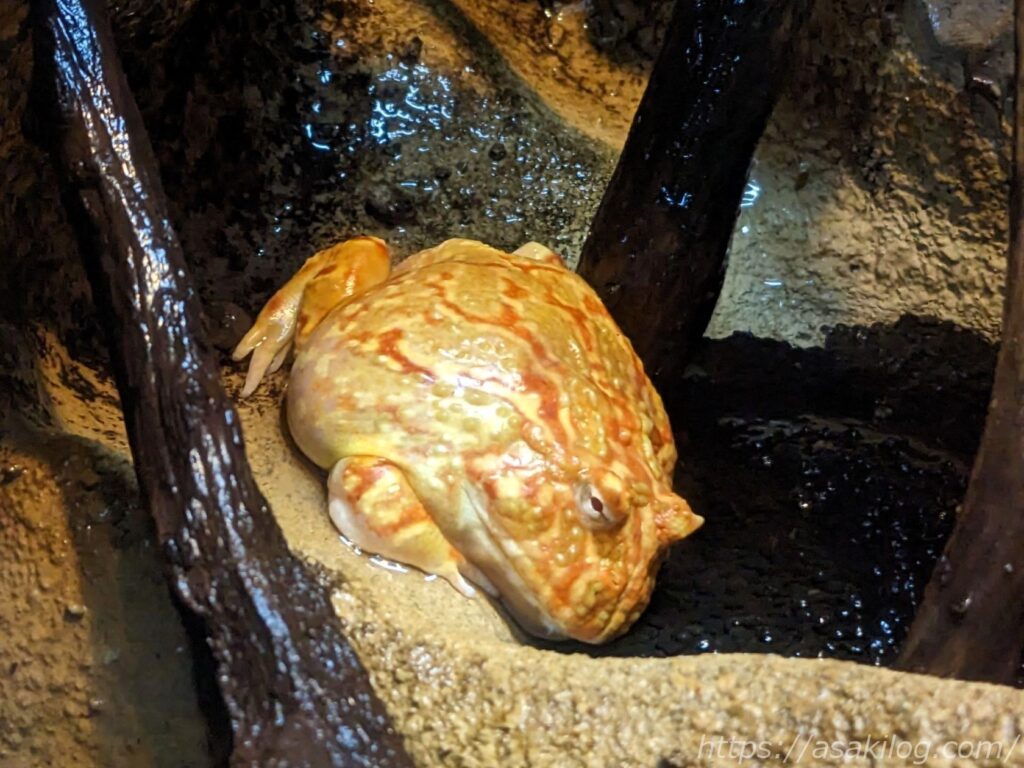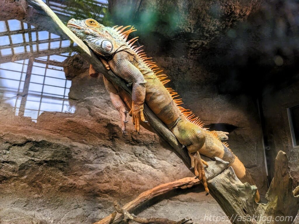 こちらの「ベルツノガエル」は、アルビノ(白化個体)なんだそう。グリーンイグアナはどこで観てもじーっとしてますね。