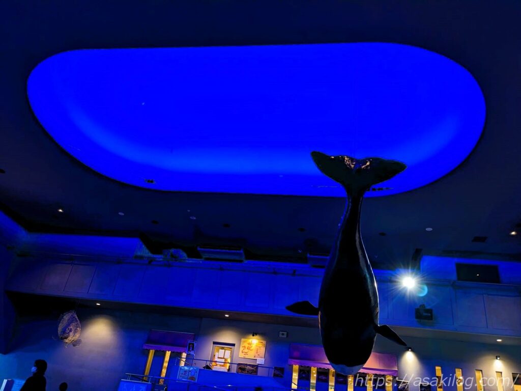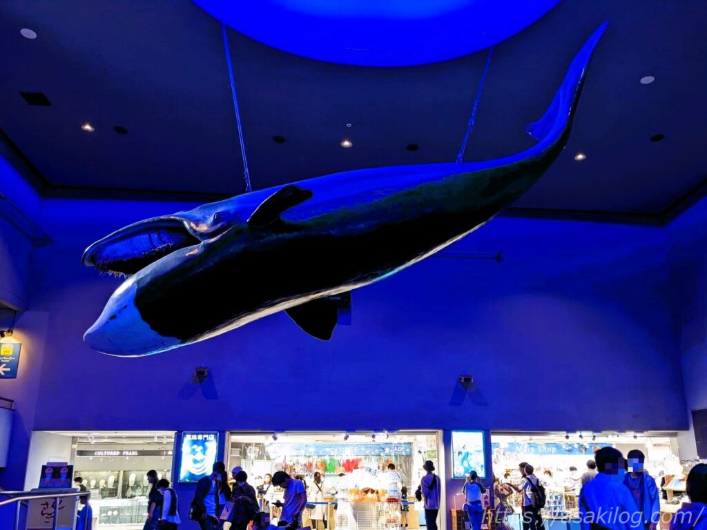 鳥羽水族館を自由に散策して、最後に立ち寄ったのがエントランスホール。上には大きなクジラのオブジェが吊り下げられていました。