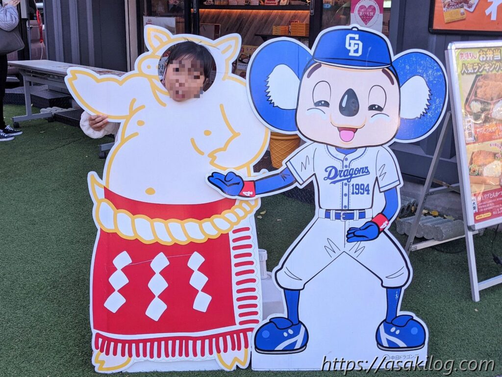 夫君に並ぶのをお願いして、YABATON SHOPの正面から撮影してたら、矢場とん+ドアラの顔出しパネルを発見! 夫と一緒に並んでいた娘を呼んで記念撮影(笑)