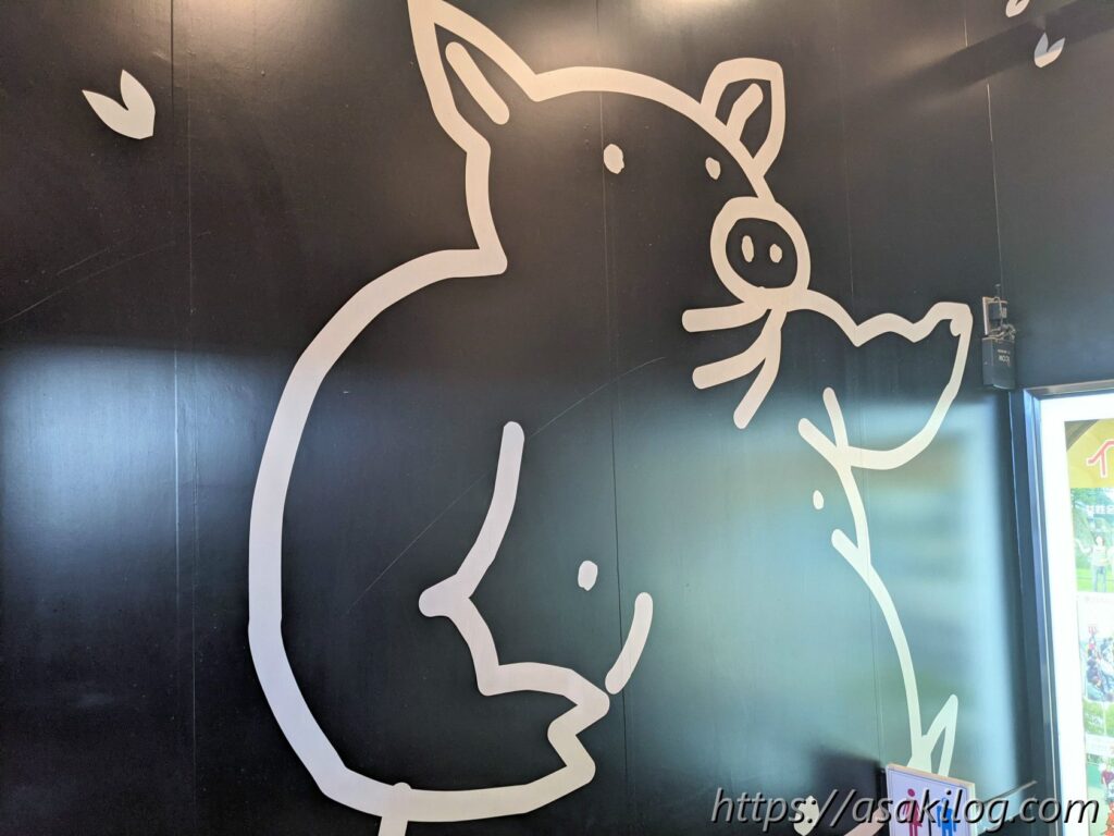 矢場とんのマスコットキャラクター豚さんは、あちこちにいます。店内入ってから階段部分で待たされている間の壁にも、シュールな豚さん。