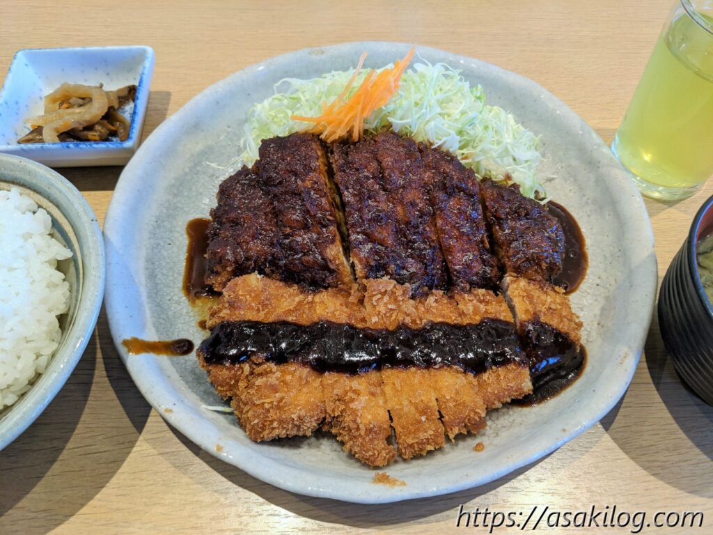 今回私が食べたのは「わらじトンカツ(1,400円)」。ロースとんかつのほぼ倍の大きさで、その名の通り「わらじ」と同じサイズなのが特徴らしい。ボリュームたっぷり!味噌だれとソースの2種類の味を食べ比べできます。味噌だれが濃厚でサクサク美味しかった~。