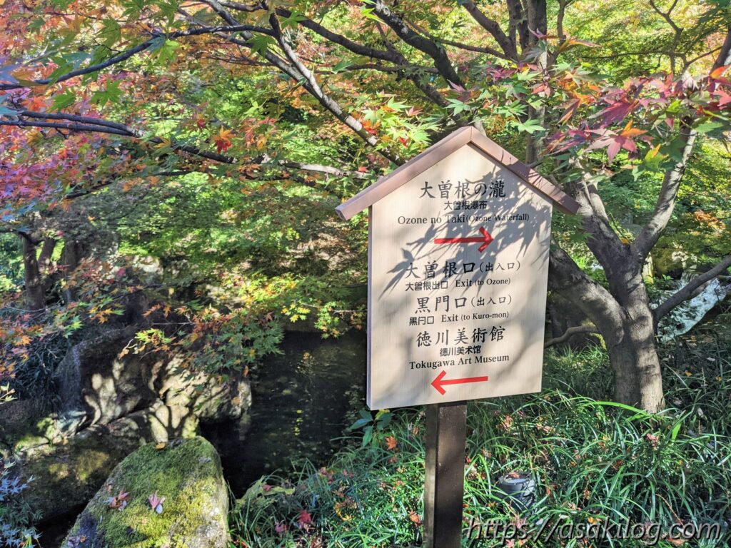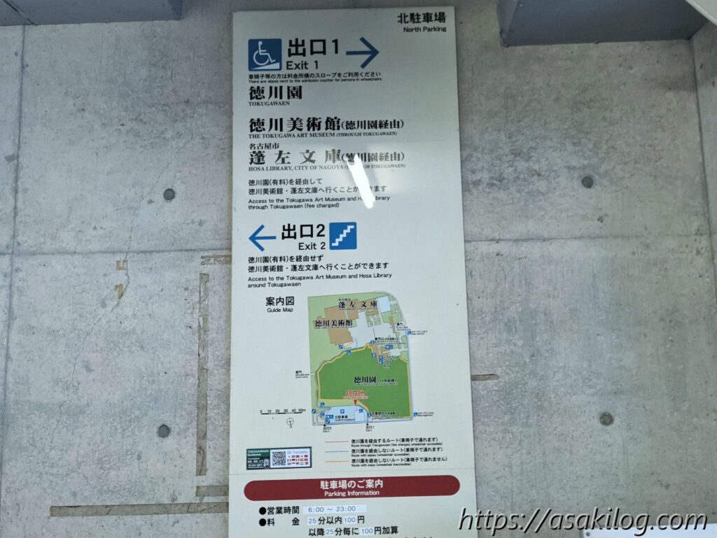 徳川園の北駐車場入口で少しだけ待ちましたが、10時20分頃に車を停めることができました。駐車場内にある案内図に沿って、出口1(大曽根口)へ向かいます。