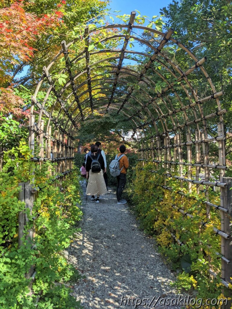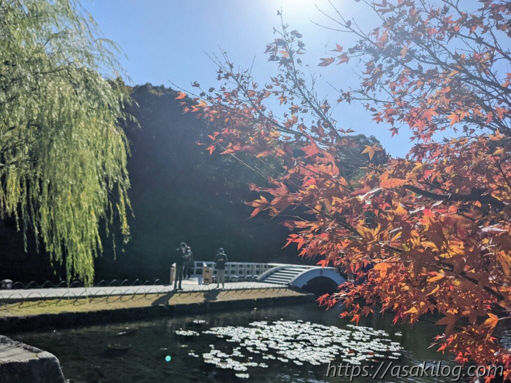 まずは龍泉湖~右側を散策。真っ赤に染まった木々の紅葉や白い椿がとっても綺麗。アーチの道をまっすぐ行くと、小さな茶室「瑞龍亭(ずいりゅうてい)」があり、この辺りから龍泉湖方面の景観を眺められます。