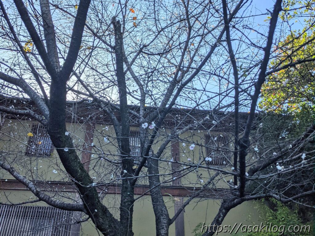 「観仙楼(かんせんろう)」に到着すると、建物右側にちらほらと「子福桜(こぶくざくら)」が咲いていました。少し調べたところ、秋から春(10月上旬~3月上旬)が開花時期の桜で、花1輪につき2~3個のサクランボがなる特徴から、この名前が付いたそう。観仙楼から龍仙湖を振り返ると、入口(大曾根口)方面を眺められます。