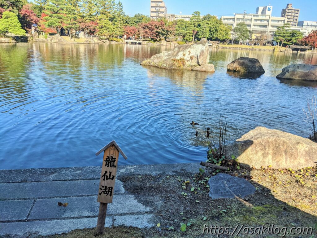 龍仙湖まで戻ってきました。左の写真は「西湖堤(せいこてい)」。古くから文化人憧れの景勝地・中国杭州の西湖湖面を直線的に分ける堤防を縮景したもの。異国情緒を日本庭園の中に取り入れているそう。