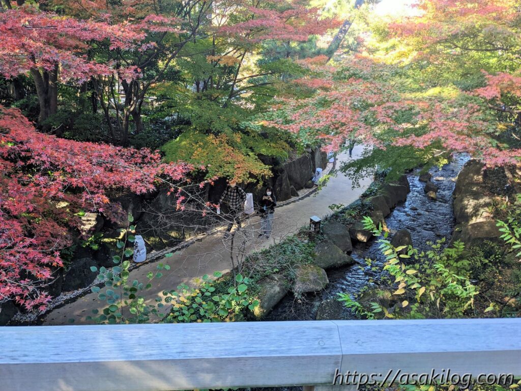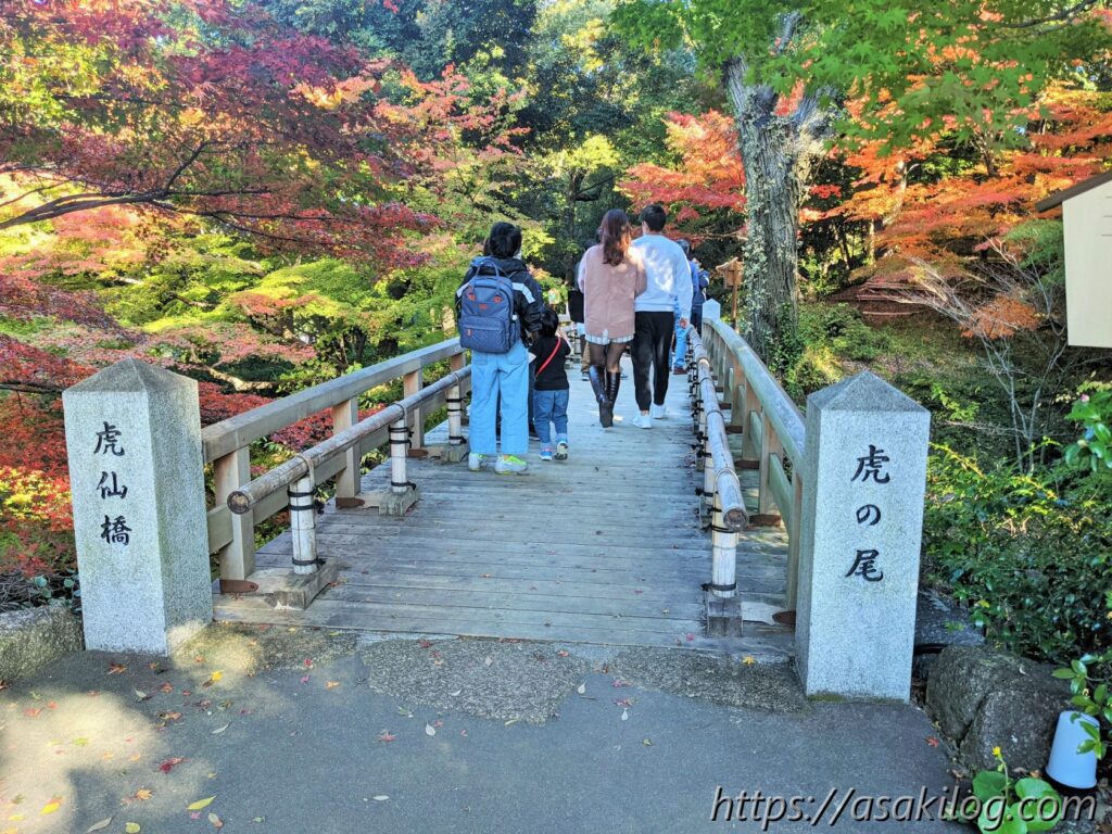 こちらは「虎の尾(とらのお)」に架かる、檜造りの木橋「虎仙橋(こせんきょう)」。5m下の渓流を見下ろせます。緑と赤の木々がとっても綺麗。
