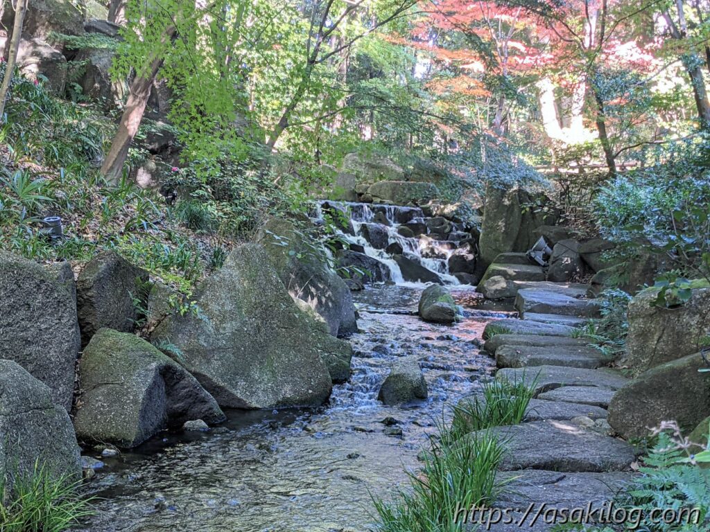 徳川園の大曽根口から入園すると、目の前には海に見立てられた「龍泉湖(りゅうせんこ)」があります。池泉回遊式庭園の中心的存在で、徳川園では龍泉湖をぐるりと一周散策・途中で滝に立ち寄りつつも、紅葉鑑賞をたっぷり楽しめます。