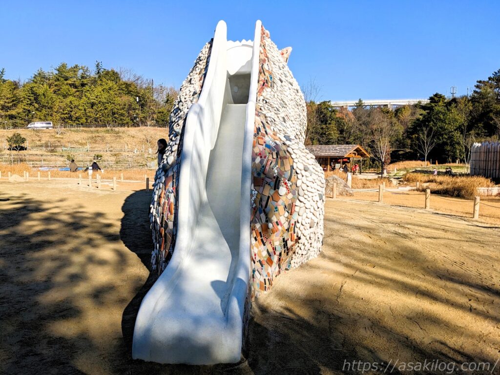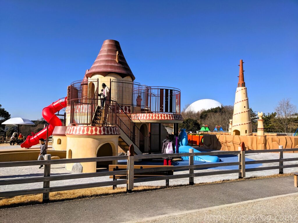 こちらはもののけの里に向かう途中にあった「猫の城遊具」。スタジオジブリ作品「猫の恩返し」の猫王の城をモチーフにした城(滑り台3基)や、迷路・タワー及びターザンロープ2基などで構成された遊具なんだそう。小さなお子様が楽しめそうなスポットです。