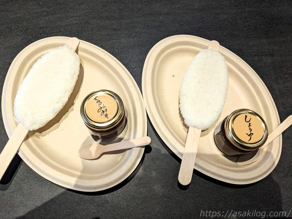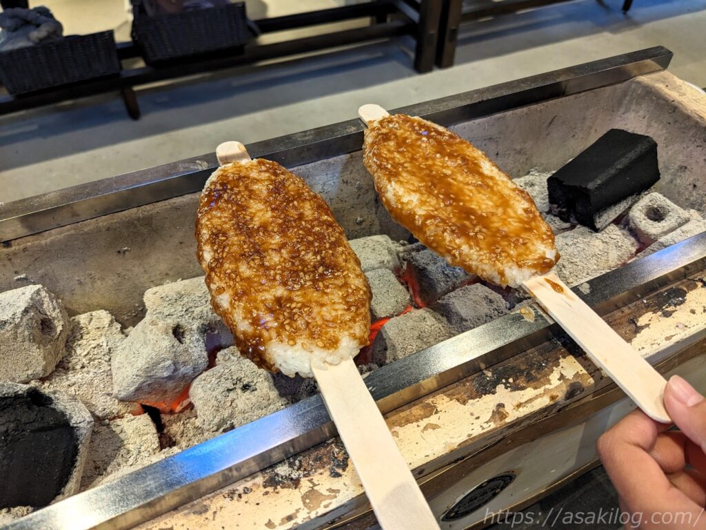 タタラ場での五平餅炭火焼体験では、七輪の炭火で焼きながら、お好みタレをつけて味わえます。タレの種類は「くるみみそ」「しょうゆ」「ナポリタン」の3つから選択可能。今回私たちは「くるみみそ」「しょうゆ」の2つを選びました。