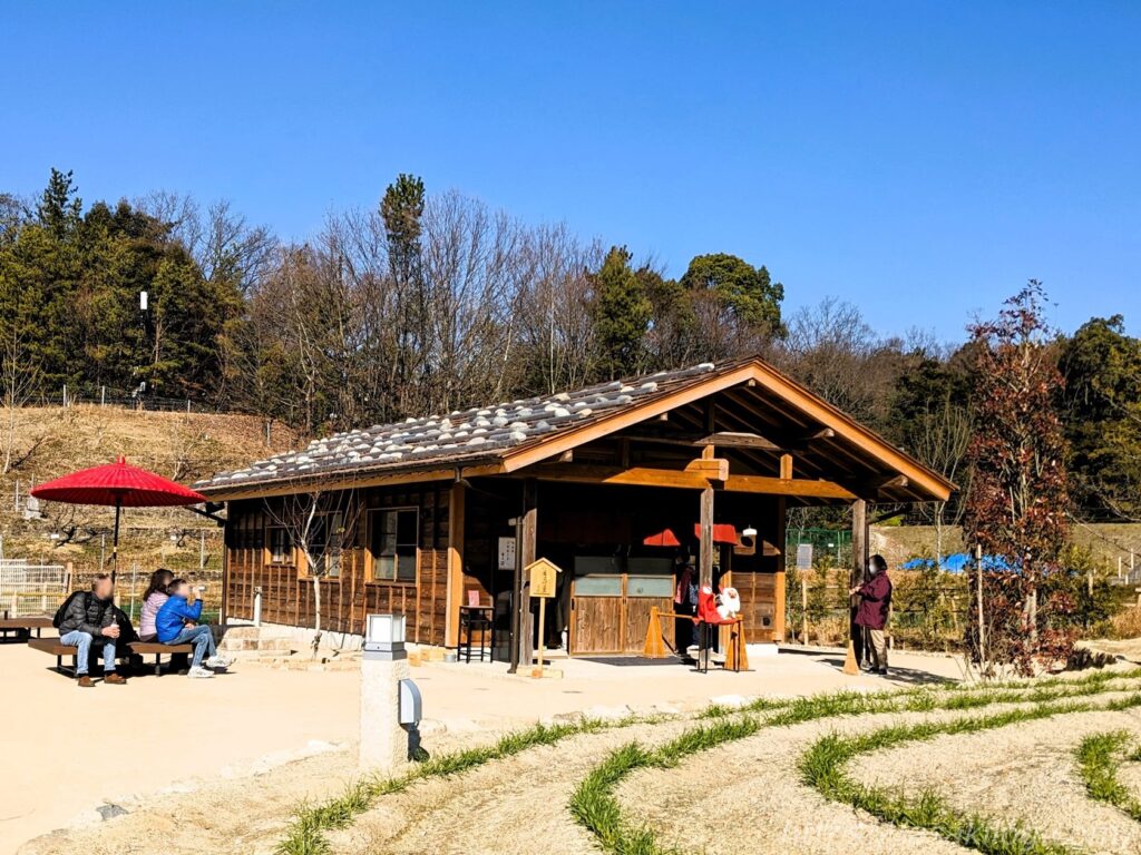 2つのオブジェの奥には、もののけ姫に登場する製鉄民の集落にある「タタラ場」をモチーフにした体験学習施設があり、郷土料理「五平餅」の炭火焼体験ができます。(1人1,200円)
