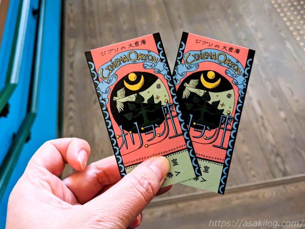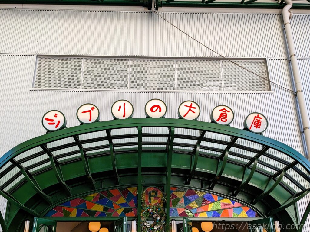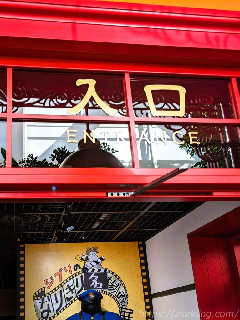 こちらが「ジブリの大倉庫」の入口。鋳金のアーチにステンドグラスがはめらています。入口で「映像展示室オリヲン座」のチケットを貰えるので、大切にとっておきましょう。