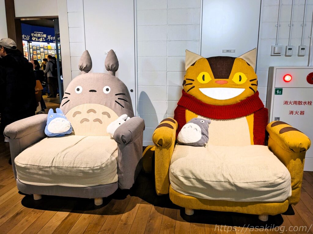 トトロやネコバスのソファは座り心地抜群。カウンター越しに座って、トトロに話しかけてみましょう(笑)。