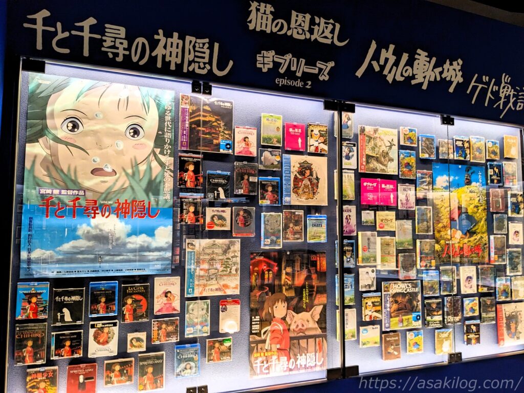 2つめの部屋には、スタジオジブリ作品26作の映像と音楽のパッケージソフトがずらりと並んでいます。国によって公開されたデザインが違うのも面白いですね。