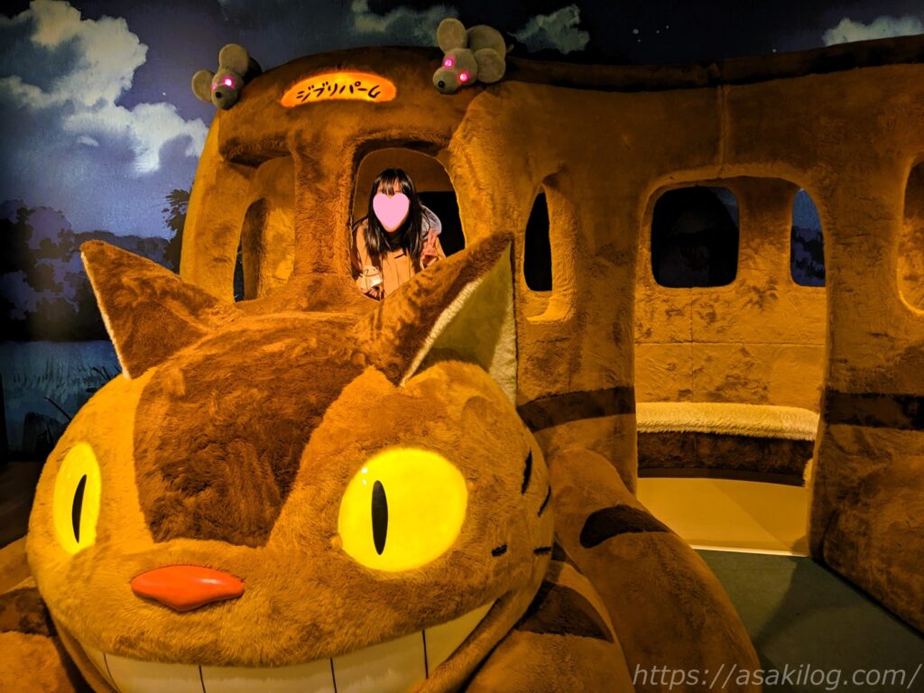 3つめの部屋には、大人も子どももゆったり乗れるサイズの大きなネコバスが待っていて、壁もイスもフカフカ~。娘の写真を見ると、ネコバスの大きさが分かりますね。