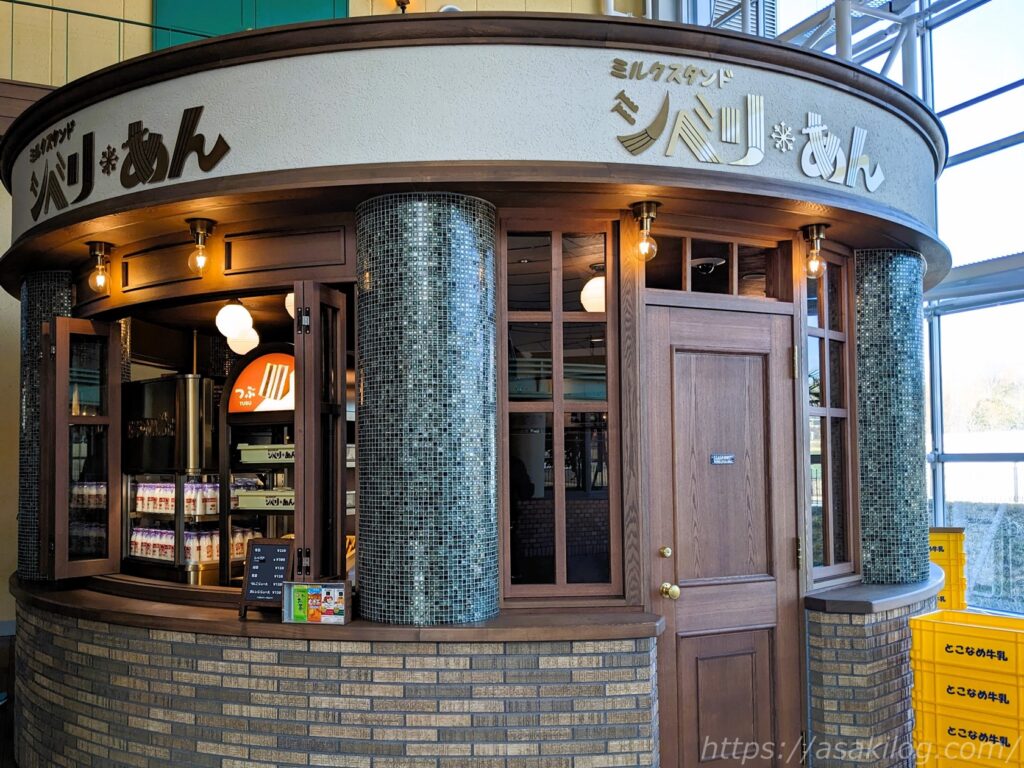 ジブリの大倉庫2階にある「ミルクスタンド シベリ❆あん」は、地元産の牛乳をオリジナルデザインの瓶で提供するカウンター式のミルクスタンド。スタジオジブリ作品「風立ちぬ」に登場したお菓子「シベリア」を販売するスポットです。
