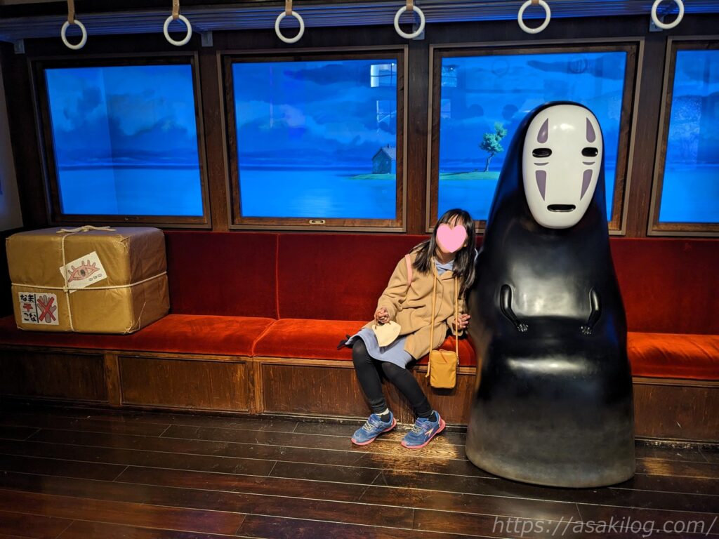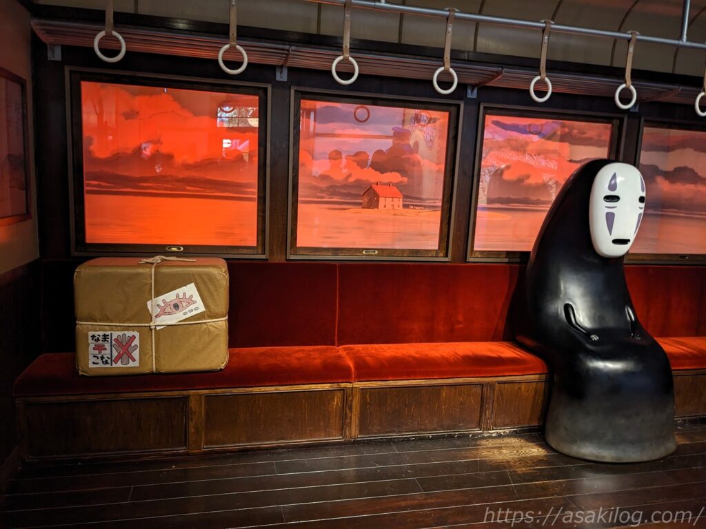 車窓が昼・夕方・夜と変化するのが印象的。カオナシの横に座れば、千尋になりきって写真を撮影できます。