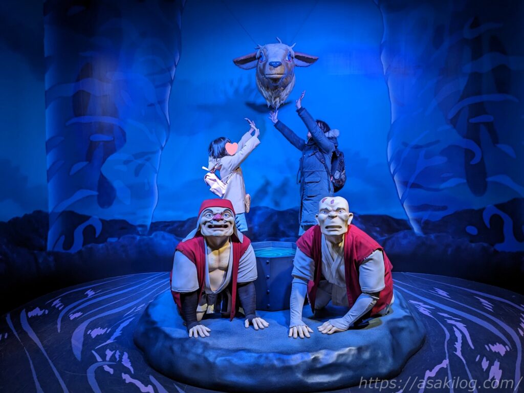 そして右の写真が「もののけ姫」のコーナーで、アシタカとサンがシシ神に首を返す名場面。親子でなりきってみたけど、どうでしょう? ここでは音と光の演出が激しかった。