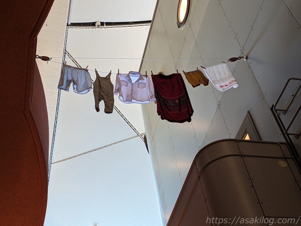 ジブリの大倉庫入口近くの通りを見上げると、洗濯物がぶら下がっている空間も。