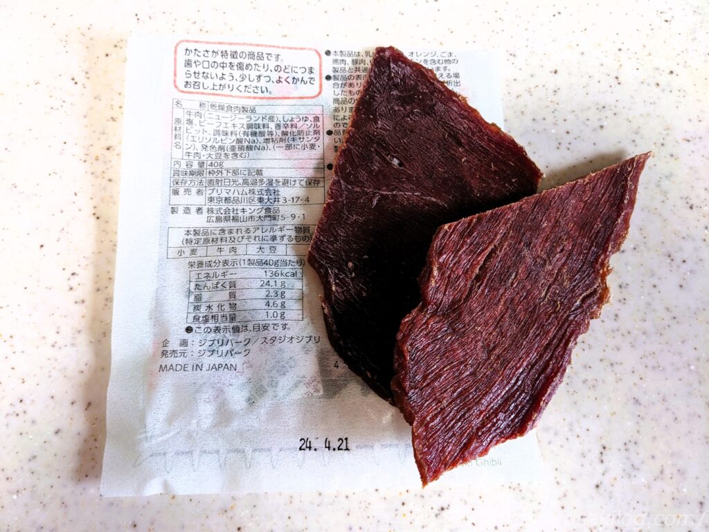 もののけの里で試しに購入した「ジャーキー(干し肉)」を後日開封したところ、ニュージーランド産の牛肉使用で、大きなものが2枚入っていました。封を開けると強烈なジャーキーの香り!ものすごく硬いのでは?と覚悟してましたが、食べたい分だけを手で割れるくらいの硬さでした。味が濃いので、少しずつ楽しむのがおすすめです。